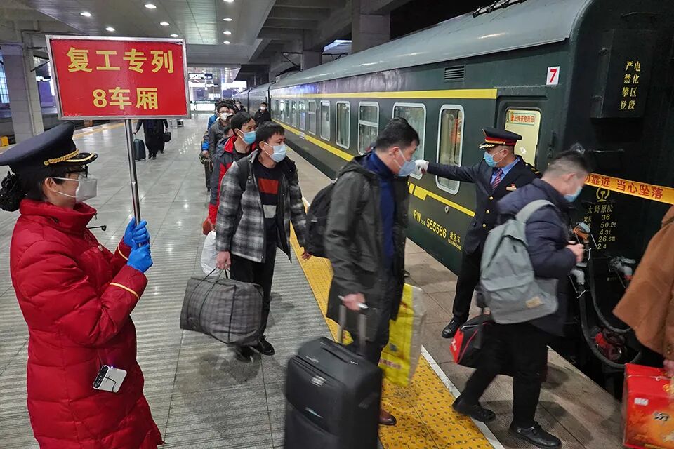 2月29日,在山东烟台火车站,务工人员准备乘坐复工专列。