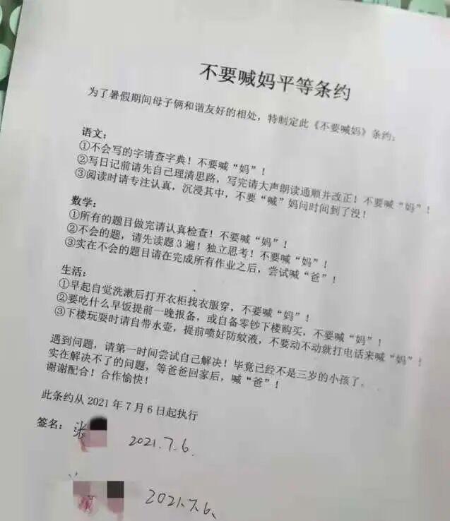 △近日,四川成都的一位妈妈因为被7岁的儿子不断“呼叫”,和儿子签下一份“不要喊妈妈条约”。