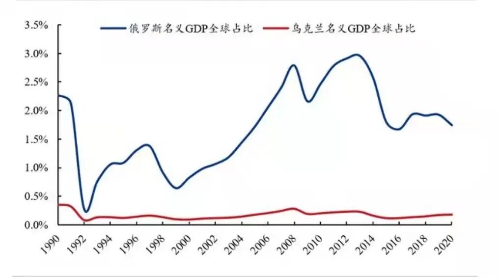 俄罗斯、乌克兰名义下GDP全球占比示意图