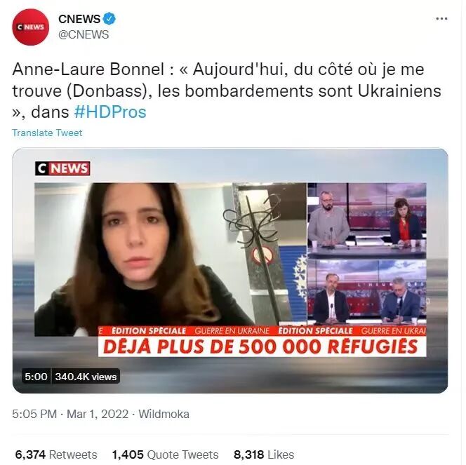 CNews的推特公布了一段采访视频,援引驻顿巴斯地区记者博内尔的话:“今天,在我所处的一侧(顿巴斯地区),轰炸来自乌克兰当局。”