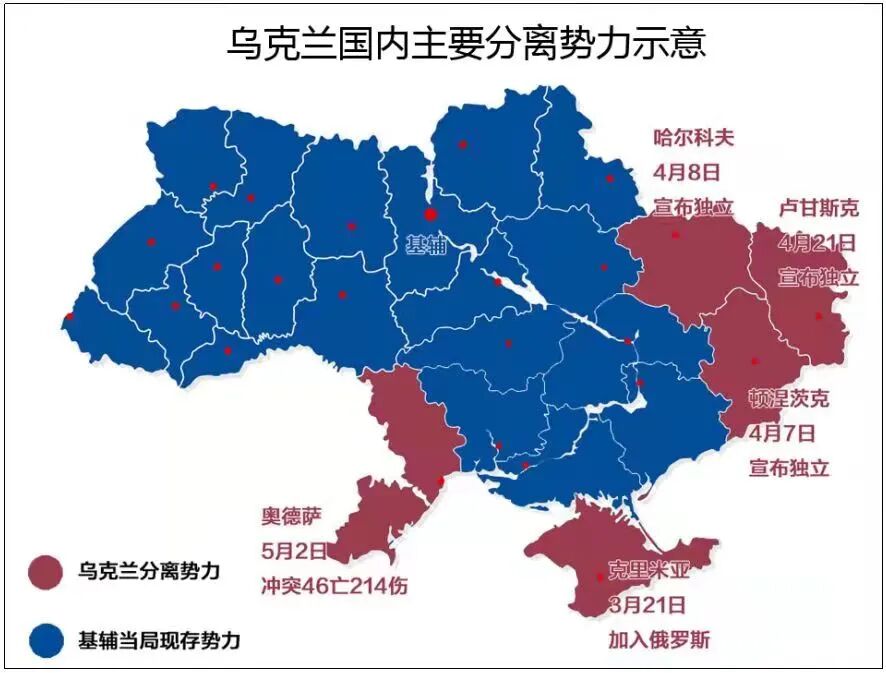 2014年,乌克兰在欧美国家策划下爆发颜色革命,图为革命时期混乱的街头和国内分裂势力示意图