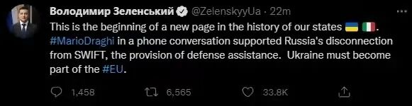 图片说明:乌克兰总统泽连斯基在大概2小时时间内连发三条推文,称自己正在和相关国家、组织领导人交谈讨论,并先后就“乌克兰入欧资格”表示:“现在是决定乌克兰是否加入欧盟的关键时刻”“我相信欧盟也会选择乌克兰”“乌克兰必须成为欧盟的一部分”,表达“入欧”决心。