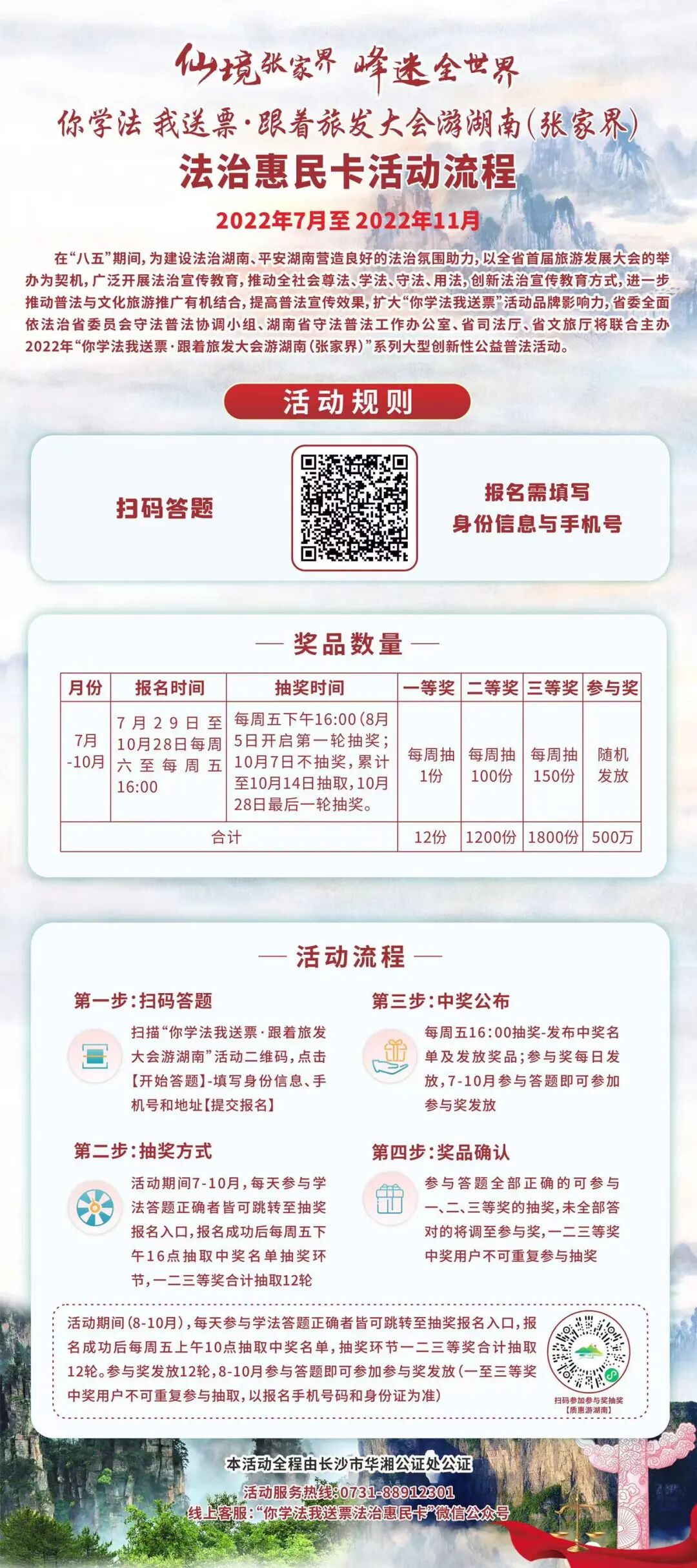 主办方每周五下午4点从前七天答题满分者中随机抽取1名一等奖、100名二等奖和150名三等奖,奖品总额超1000万元。其中,一等奖奖品总价值1万元,包括“你学法我送票法治惠民卡”、手机、四星级酒店住宿及张家界文旅大礼包。据介绍,活动将总计送出3012张“你学法我送票法治惠民卡”,该卡价值超1600元。持卡用户可在6个月有效期内,免费游玩张家界武陵源、天门山、大峡谷等A级景区,并享受部分交通费用免费。