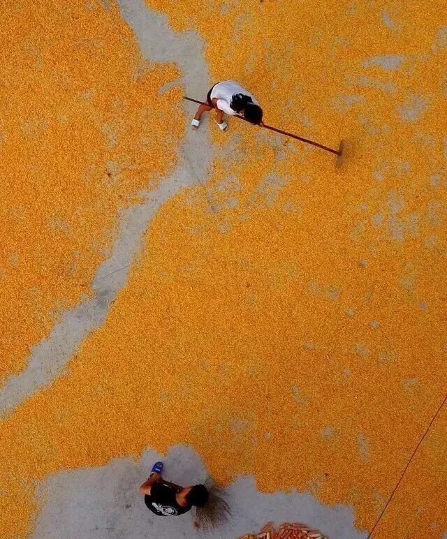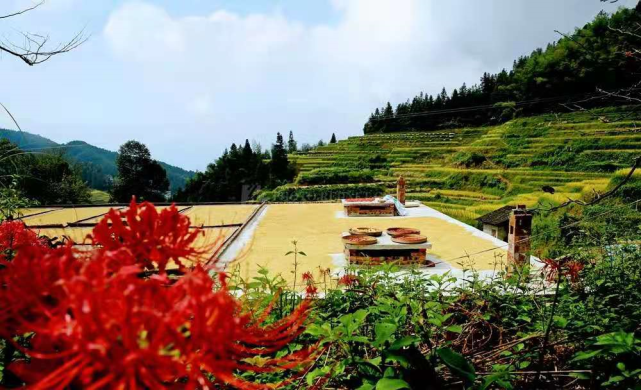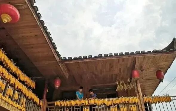 秋天,在城步苗族自治县丹口镇边溪村,小朋友在吊脚楼前翻晒刚收获的玉米。村民把收获的玉米、辣椒等谷物摆放在吊脚楼上或庭院中进行晾晒,呈现出一幅幅漂亮的“晒秋图”。