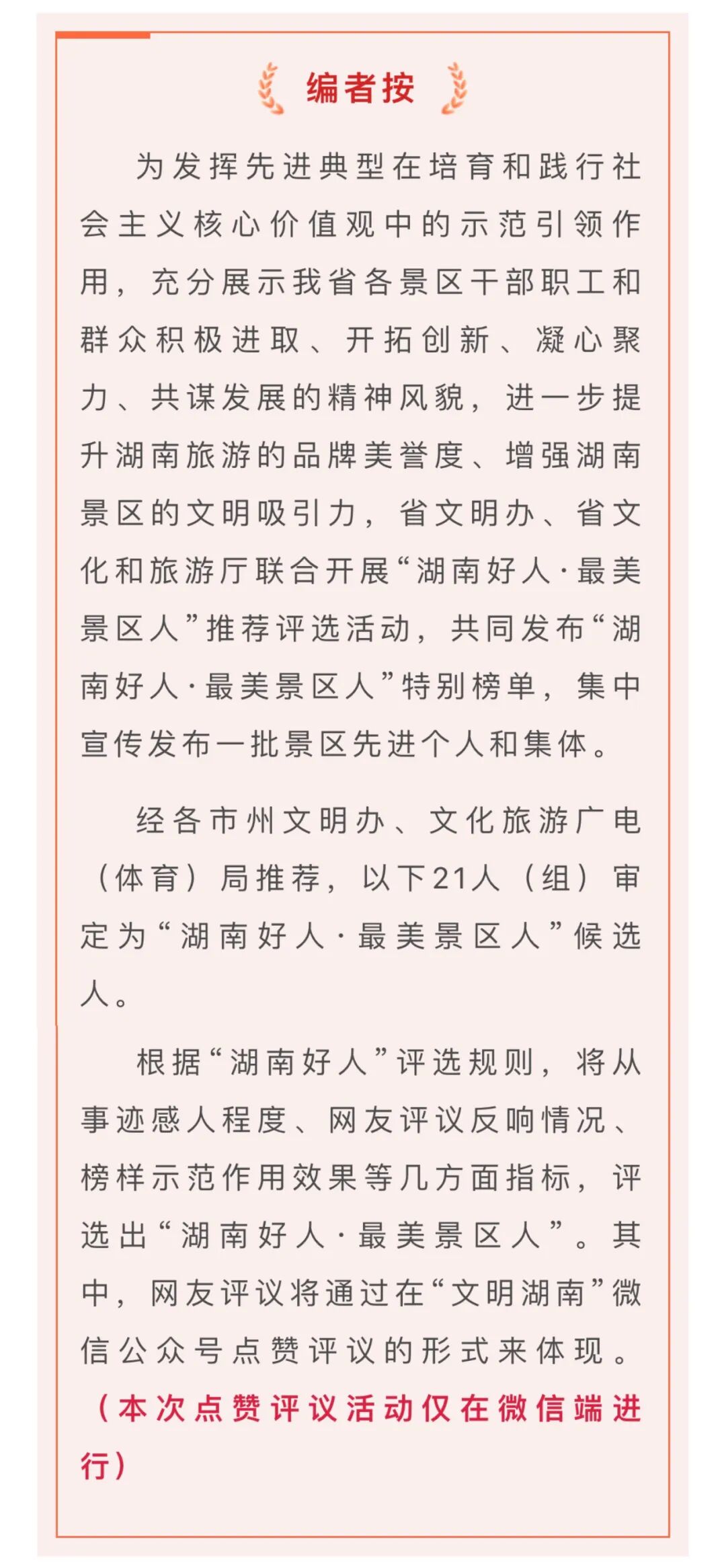 点赞评议方式:关注“文明湖南”公众号后才能评议。点击链接进行点赞评议→ “湖南好人·最美景区人”候选人点赞评议页面