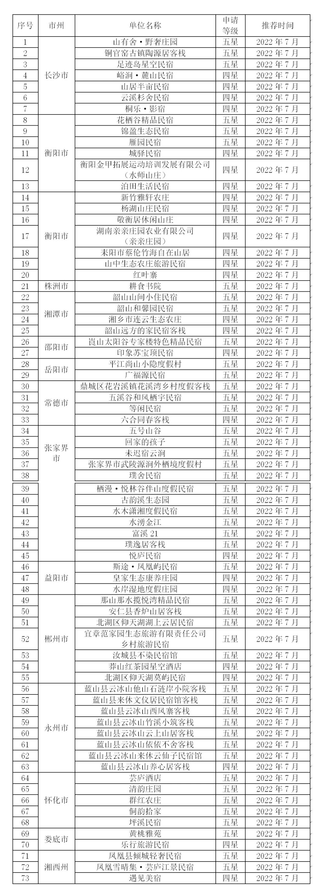 经旅游民宿自愿申报,在严格审查的基础上,各市州旅游民宿等级评定委员会初选和推荐,湖南省旅游民宿等级评定委员会审核,拟同意山有舍·野奢庄园等73家旅游民宿具备申请评定五星级、四星级旅游民宿的资格。根据《湖南省旅游民宿等级评定管理办法》,现公示如下: