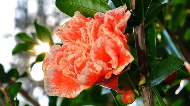 更美的还有它的花朵。石榴花开于仲夏时节,花红似火,故有“榴月”之称。而花瓣的层层堆簇褶皱又像极了美人裙裾,也就流传出“芙蓉为带石榴裙”的典故。