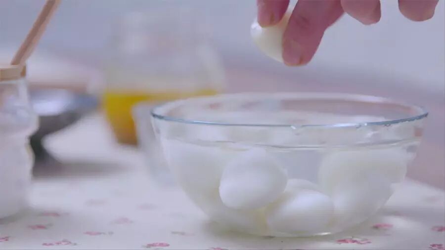 鹌鹑蛋水煮后剥壳,放入水中冷却。