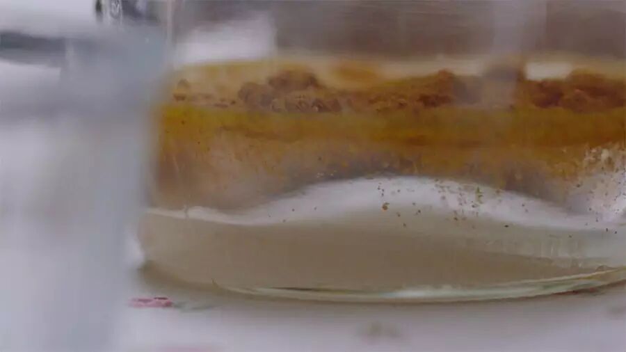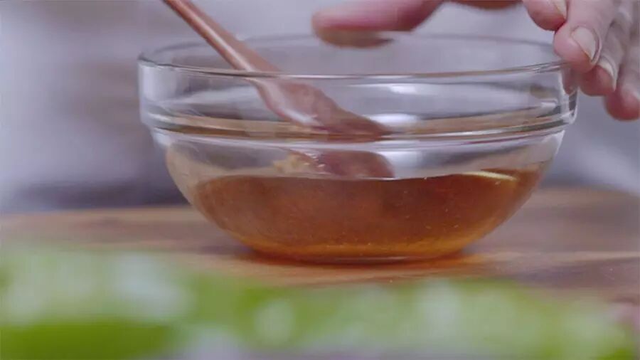玻璃瓶中倒入醋、糖、咖喱粉,充分搅拌,做成汤料。