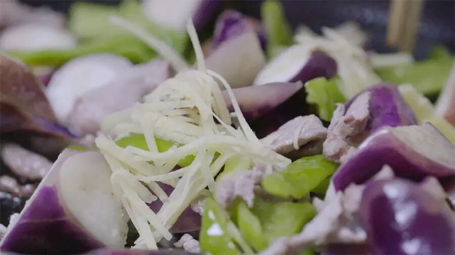 热锅倒油,先炒肉丝,再将茄子、青椒下锅炒制,最后加入姜丝。等肉丝熟后,加入之前调好的味噌酱,再炒2-3分钟(放入调料后较容易烧焦,注意火候),出锅前加入生抽。这样,味噌茄子就做好了。