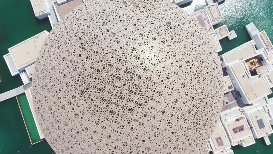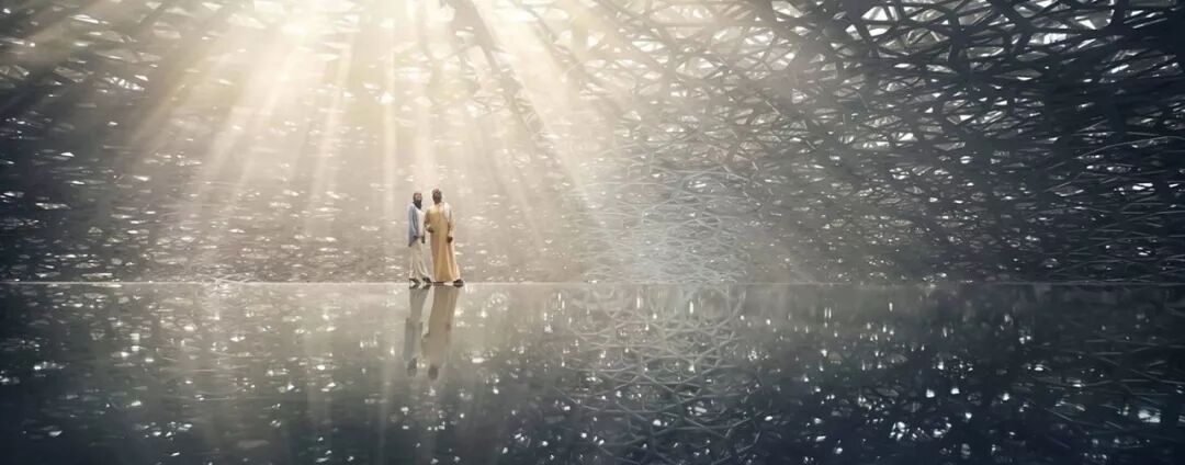 阿布扎比卢浮宫直径180米的穹顶由多层镂空金属交错叠加搭建而成,阳光穿过镂空处漏进地面,呈现出棕榈树林下枝叶婆娑的效果。阿布扎比附近的艾因绿洲(Al-Alin)被认为是阿拉伯半岛文明诞生的开始,正是在这处以棕榈树林为主的绿洲里,阿拉伯人利用雨水和地下水建造了水利系统,人口得以繁衍生息并迅速壮大。因此,对于阿拉伯人来说,棕榈树有着特殊的意义。和阿布扎比最大的清真寺“谢赫扎伊德清真寺”相仿,阿布扎比卢浮宫也使用了通体白色的建筑色调,并且同样在建筑物周围设计了水池(下图为透过穹顶洒落地面的阳光所形成的“阳光雨”)。