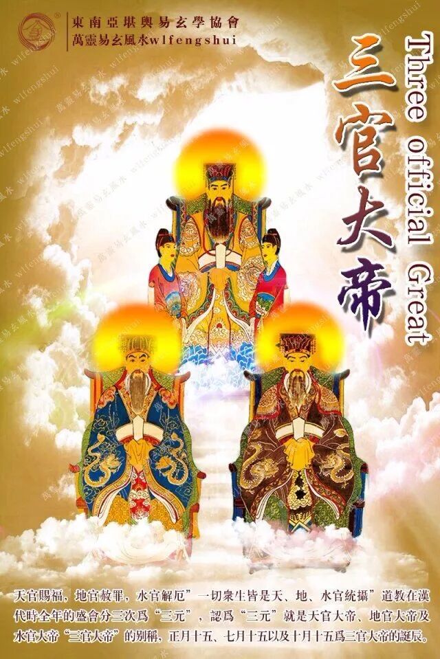 三官大帝,便是我们熟知的天官、地官、水官,亦称“三官”,又称“三元”,为道教较早供祀的神灵。一说天官为唐尧,地官为虞舜,水官为大禹。道经称:天官赐福,地官赦罪,水官解厄。