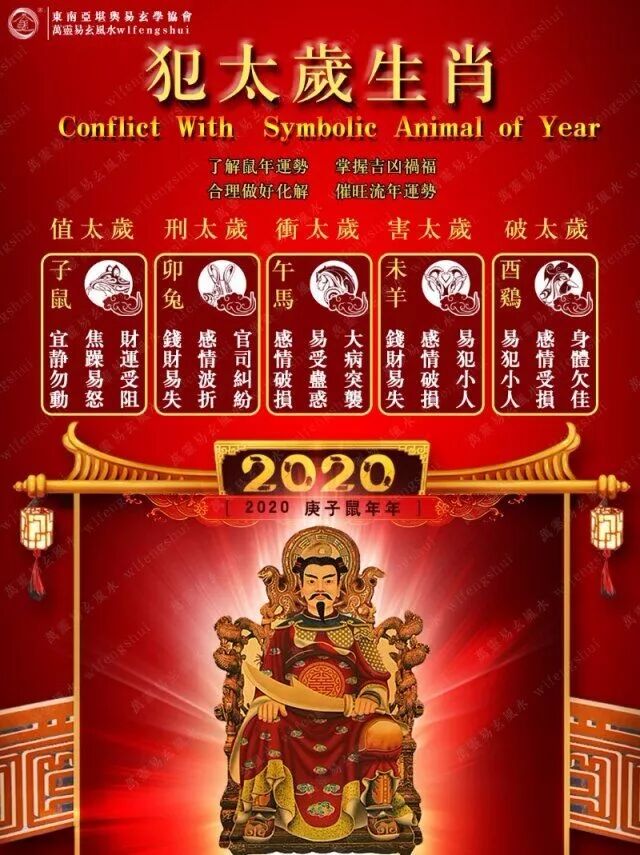 万灵易玄重点提醒2020鼠年冲犯太岁的以上五个生肖——鼠(值太岁)、马(冲太岁)、兔(刑太岁)、羊(害太岁)、鸡(破太岁),犯太岁多为不顺,太岁压运起祸端,伤财惹气心不甘,太岁年破财生灾,是非缠身!