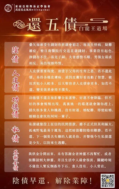 在我做还阴债法事之前,我曾好长一段时间自以为是的视之为封建迷信。甚至当白龙王许道长直截了当的建议我先把欠的阴债还掉,说我阴债不少,多年来生活富足却从无偿还之意,因此在我顺风顺水多年之后,地府便开始讨还阴债,而噩梦只不过是阴债作祟的一种警告罢了。我真不习惯道长这么简单的打发。却不知道道长是多年的行法经验指的最快捷的阳光之路。朝着阳光着,就有新的希望,如果固步自封,就只能陷入黑暗迷茫中永无出期。