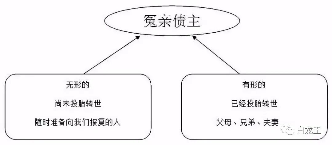 冤亲债主分成两种:一种是无形的:目前还未投胎转世。一种是有形的:已经投胎转世,准备这辈子来向我们报恩报仇的。如父子、兄弟、夫妻、朋友……都是有形的冤亲债主。