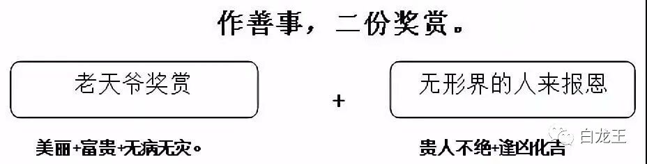 上天的奖赏或惩罚:如果我们做了善事了,上天会根据我们所做的善事加以评断,然后赐福给我们,这是我们自己种的善因得来的。