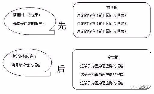 先接受前辈子作的好事或坏事该有的福报或恶报。等这些注定的福报或恶报完了,再开始这一世做好事或坏事的福报或恶报。