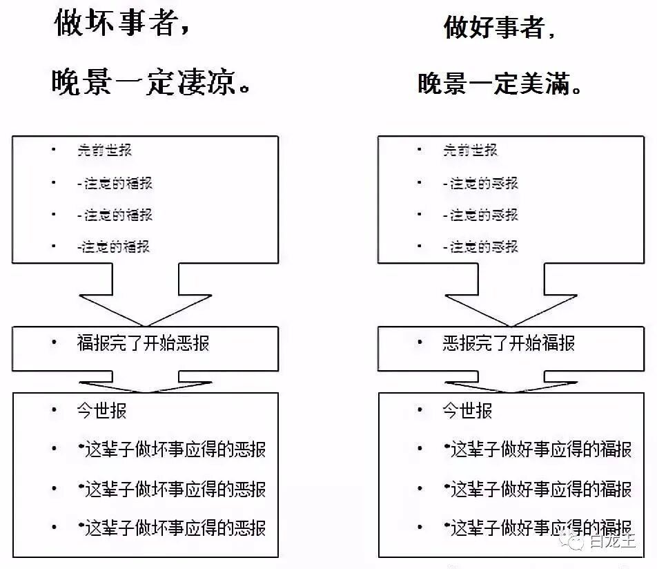 例如:这个人前世做了许多善事,这辈子注定会有福报,因为他要先受这些福报,等到这些注定的福报完了之后,他就要开始接受他这一世做坏事该有的恶报了。