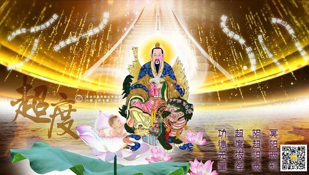 在道教而言,超度就是通过法师自己内在的内练,连接祖师或者道教神仙,把还沉沦在阴间的亡魂或者还滞留在人间的亡魂救拔出来,然后通过神仙接引,希望亡魂早日登东方青华极乐世。道教超度一般供奉的主神为太乙救苦天尊。