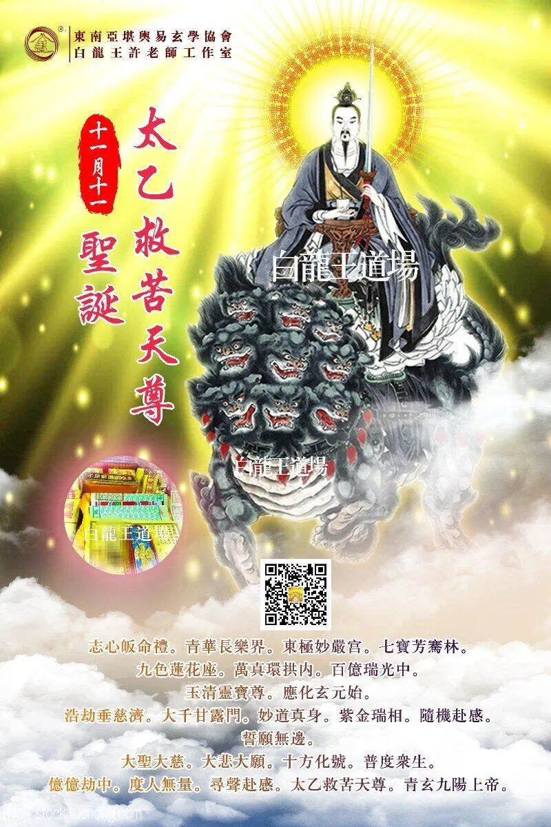 青华圣境。东极上宫。十方化号度群生。百亿光中瞻妙相。九色莲花。作慈航之彼岸。一枝杨柳。开甘露之法门。九千九万亿。同名同号圣。幢幡宝盖。接引导师。大慈大悲。寻声赴感,太乙救苦天尊。