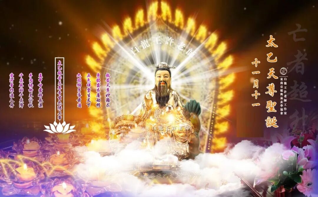 青华长乐界。东极妙严宫。七宝芳骞林。九色莲花座。万真环拱内。百亿瑞光中。玉清灵宝尊。应化玄元始。浩劫垂慈济。大千甘露门。妙道真身。紫金瑞相。随机赴感。誓愿无边。大圣大慈。大悲大愿。十方化号。普渡众生。亿亿劫中。度人无量。寻声赴感。太乙救苦天尊。青玄九阳上帝。