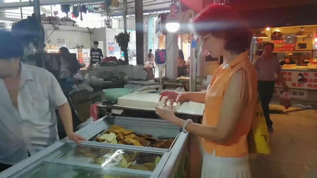她穿过好几个十字路口,在一个看起来杂乱又富有生气的小菜场里,买了榨菜和三四种不同样的豆腐。