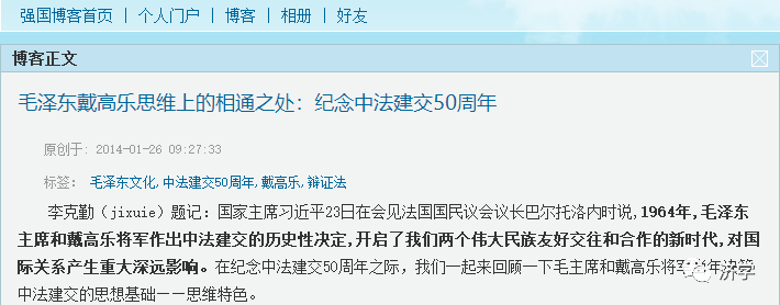 李克勤(jixuie)题记:外国政要里懂毛主席的人不少,像尼克松、希思、田中等西方政要都是,社会主义国家的领袖人物就更多了。然而,我认为法国总统戴高乐最懂毛主席,他不是刻意研究毛泽东文化,来弄懂的。戴高乐是站在他的角度,用他自己的方式来观察世界,得出了许多和毛主席相通的结论,并且他和毛主席一起道器变通了。下面是2014年初写的一篇博客,当时在新华网、人民网登出过。