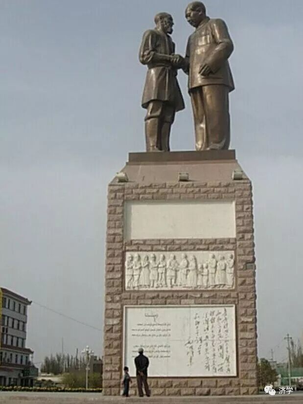 1995年,一座毛主席与库尔班·吐鲁木握手的巨型塑像,豁然矗立在于田县城西口。这是中共于田县委、于田县人民政府为鞭策下一代而建成的爱国主义教育基地。