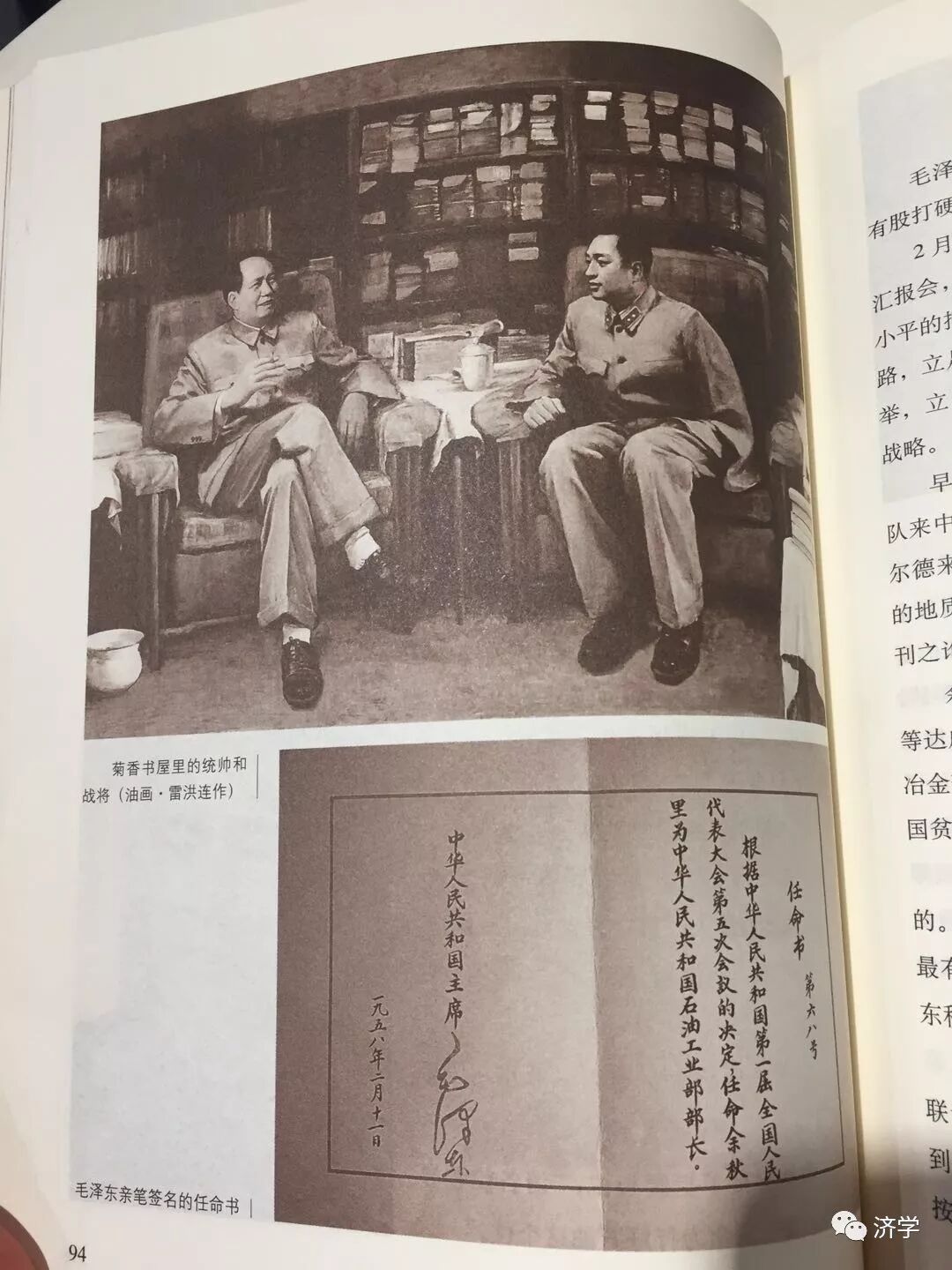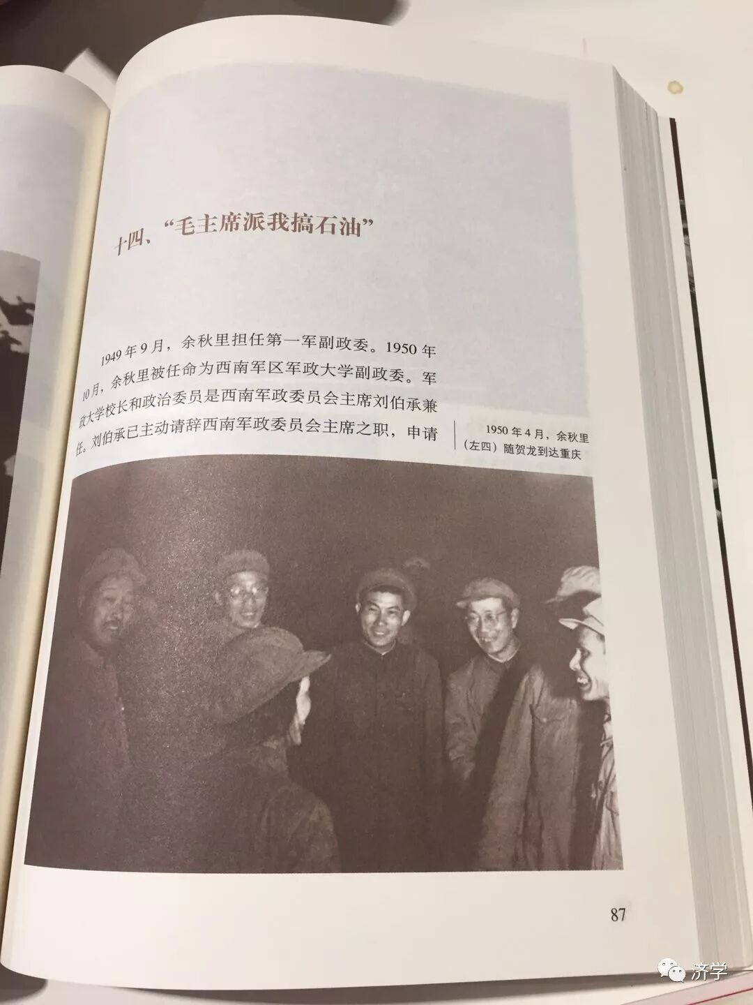 “1958年1月下旬的一天,中共中央办公厅通知我当天下午到毛主席办公室开会,并特别嘱咐,要早一点到,毛主席要和我谈话。 接到通知后,我一直在考虑,主席和我谈什么呢?联想到前几天开会,周总理把我叫到一边,对我说:‘秋里同志,我们准备让你和李聚奎同志对调一下,请你出任石油工业部部长。’我当时思想毫无准备,稍加考虑后说:‘总理,这个任务我可承受不了啊!’总理说:‘你考虑考虑,毛主席还要找你谈话。’我想,毛主席找我谈话,是不是谈这件事呢? 下午,我按中央办公厅的通知,准时来到毛主席办公室。主席让我坐下以后,对我说:’总理他们提议,调你到石油部当部长,我们都赞成,总理和你谈过了吧?’我说:‘总理和我谈过了。我考虑,我从来没有搞过工业,石油在地下,情况更复杂,这个任务我恐怕承担不了。军队中比我强的人很多,是不是另选一个人?’ 主席没有直接回答我的话。他问:‘你今年多大年纪了?’我说:‘43岁。’主席哈哈一笑说:‘43岁,儿童团嘛!’主席幽默风趣的谈话,使我们在座的人都笑了起来。 接着,主席神情严肃地说:’我过去说过,夺取全国胜利,这只是万里长征走完了第一步。我们熟悉的东西有些快要闲起来了,我们不熟悉的东西正在强迫我们去做。我们必须克服困难。我们必须学会自己不懂的东西。我们必须向一切内行的人们(不管什么人)学经济工作。拜他们做老师,恭恭敬敬地学,老老实实地学。不懂就是不懂,不要装懂。不要摆官僚架子。钻进去,几个月,一年两年,三年五年,总可以学会的。’ 主席稍停了停又说:‘我们军队的高级将领,很多都是在战争中学习战争,成了我军的优秀指挥员和政治工作干部。知识是从实践中来的。打仗、搞经济建设都是如此。’ 主席见我默默地听他谈话,又转而问我:‘你是不是不愿脱军装啊?’我赶紧说:’不是。’主席说:’部长以上干部调动,是中央决定,不是转业。’主席还笑着说:‘你如果转业,要发一笔财呢!’ 主席又说:‘李聚奎同志是个很好的同志,他年纪大了。你年轻,精力充沛。中央决定,你们两个换一换。’ 这时,参加会议的同志陆续来到了毛主席办公室。我向主席说:‘主席,我服从中央的决定。我一定按照你的指示,在实践中去学习,努力把工作做好。’ 主席说:‘好!就这么定了。你如果缺干部,可以指名要,军以上干部你愿意选谁就选谁。’ 主席和我谈话的时间不长,但给了我深刻的启示,给了我信心和力量。‘我们必须向一切内行的人们学经济工作,恭恭敬敬地学,老老实实地学’,成了我的座右铭。在以后24年多的经济工作中,如果说我能学到一些工业、经济方面的知识,做出了一些成绩,都是得益于毛主席的亲切教导。1958年2月11日,第一届全国人民代表大会第五次会议通过决定,任命我为石油工业部部长。我在总后交代完工作后,于3月初正式到石油工业部上班。”