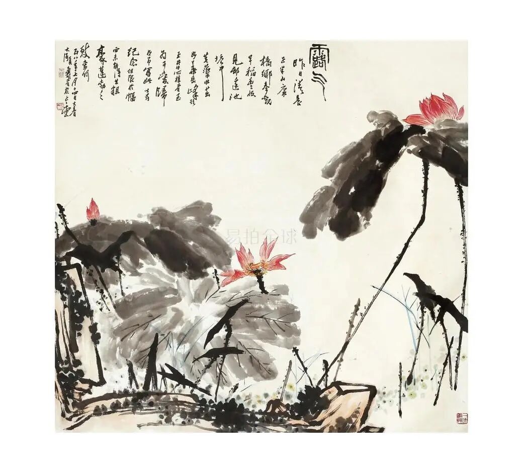 潘在20世纪五六十年代,将“不平”锋线演示得最倾国倾城的范例有两项:“雁荡野卉”与“荷塘映日”。真正将“不平”锋线所凝冻的巨匠生命锐气,发挥到庆典般火红、酒神般浪漫的诗境高度的,仍当数潘1958年后绘的“荷色映日”画系。