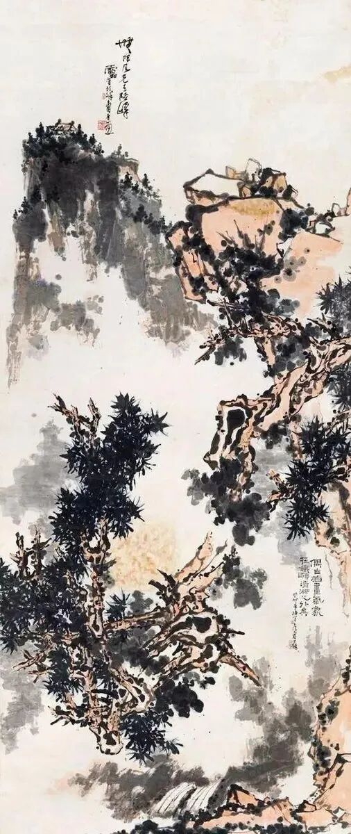 请凝神观赏潘1963年绘的《无限风光图》,你将真正领悟此图所以要第三次盖“霸悍”印的底蕴。此图主角是一株在深谷做蟠龙般腾空翻滚的倒悬苍松,呈S状,占三分之二画面。上方其余画面飞峙二峰,一灰一赭,赭近灰远,隔空遥望。此图冠名“无限风光”。此图右侧飞白处有竖排纤细隶书(题跋):“偶作指画气象,在铁岭、清湘之外矣”。“清湘”即石涛,潘最敬仰的清初画坛旗帜。此图系“指墨画”,潘认定“指墨画”是创始于清初高且园(号铁岭),故题跋会让“铁岭、清湘”并置。然要害是潘自评此图“气象”之大,宛在“铁岭、清湘之外”。言下之意,不说也罢。