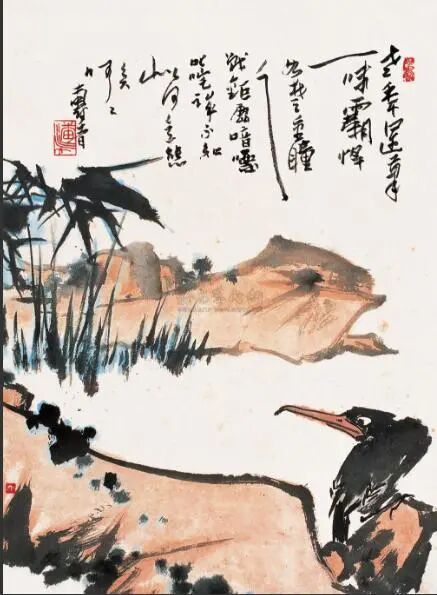 第一步,潘极推崇八大、石涛的绘画,更仰慕其艺术人格:“石涛、八大是画家,又是出家人,无俗念,至少俗念比在家人少,所以他们的绘画成就高,至今无人可与他们相比”。潘作为一个道德自律甚严的巨匠,他远比一般职业画家明白:谁能真正登上绘画史顶峰,这与其说最终取决于笔墨,毋宁说首先取决于品格、意趣,“意趣”上“高人一等”,其“用笔着墨”也就将“高人一等”。高就“高”在一般画家做不到脱俗而臻不俗,“高”品格、“高”意趣者能做到脱俗而臻不俗。然俗世又往往不解或曲解巨匠之超凡不世。这用潘的五言诗来说,即“气可撼天地,人谁识哭歌”;这用潘的题画诗来说,即“翠鸟不知青鸟事,听风听雨老横塘”;这用水墨造型来喻示,亦即潘笔下的那头独立野塘的鱼鹰,一身玄羽,青瞳朝天,金喙似剑,斜指苍穹,尘世间的凡夫俗子皆不入其法眼。这也就“霸悍”得可以。这是潘1961年第一次用“霸悍”印的《野塘清趣图》。
