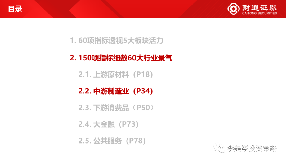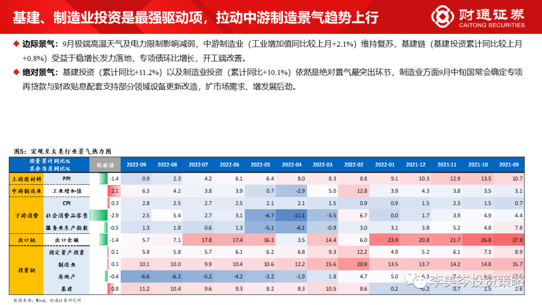 1)基建、制造业投资超过出口连续两个月成为最强分项,带动中游制造景气趋势上行;