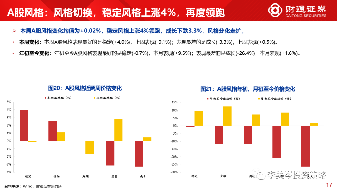 A股风格:表现最好的是消费(+2.8%),上周表现(+0.9%);表现最差的是周期(-1.7%),上周表现(+0.9%)。