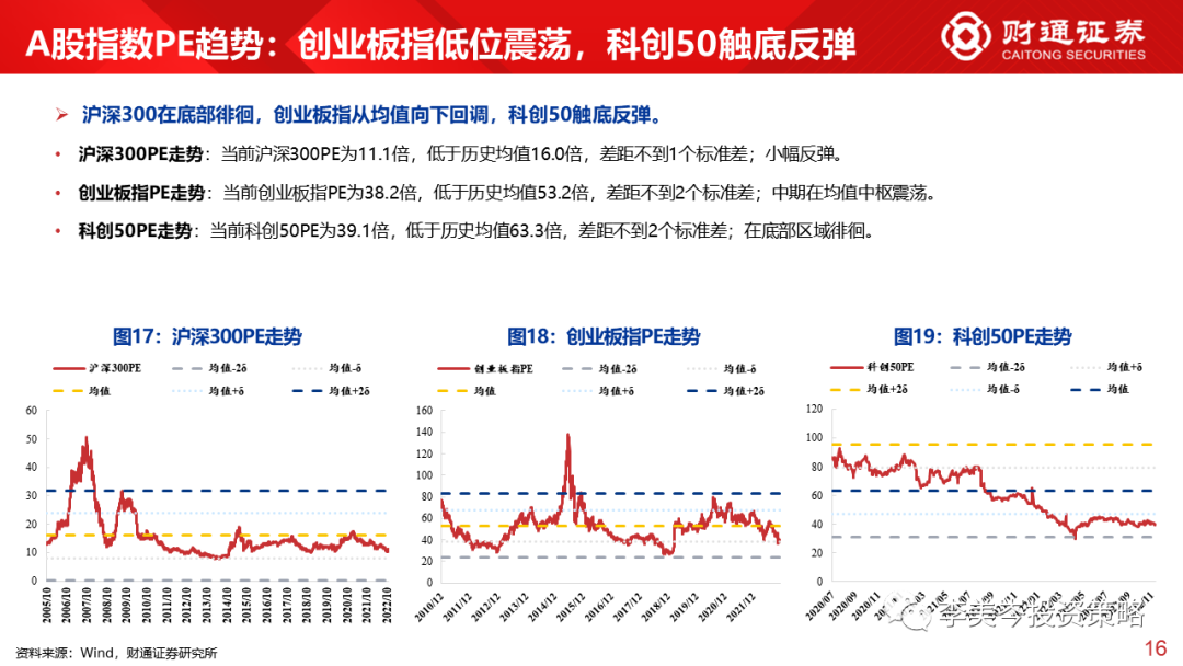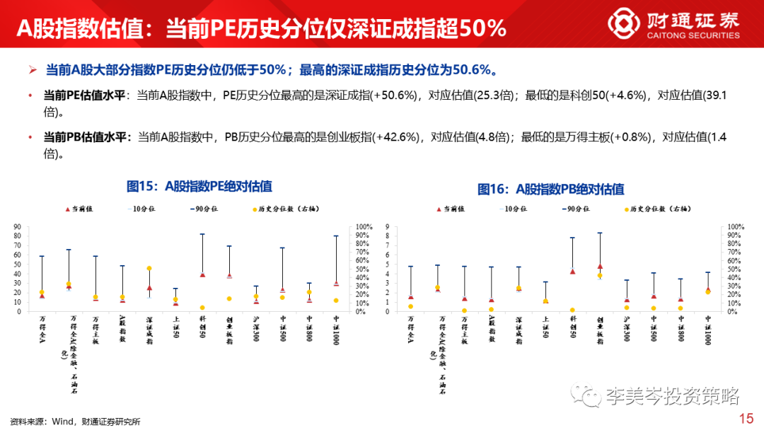 A股指数:PE历史分位最高的是深证成指(+50.6%),对应估值(25.3倍);最低的是科创50(+4.6%),对应估值(39.1倍)。
