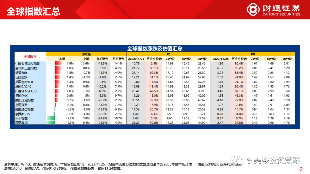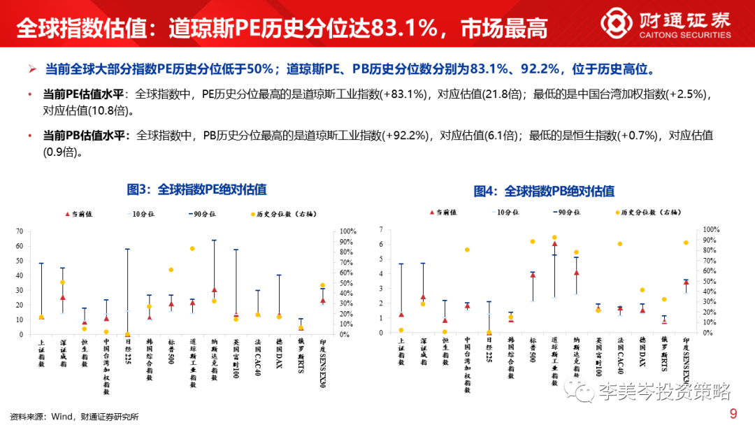 全球指数:PE历史分位最高的是道琼斯工业指数(+83.1%),对应估值(21.8倍);最低的是中国台湾加权指数(+2.5%),对应估值(10.8倍)。