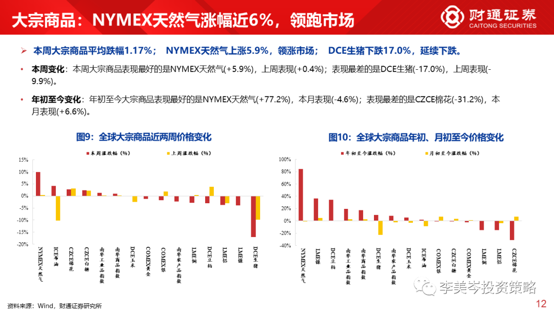 大宗商品:表现最好的是NYMEX天然气(+5.9%),上周表现(+0.4%);表现最差的是DCE生猪(-17.0%),上周表现(-9.9%)。