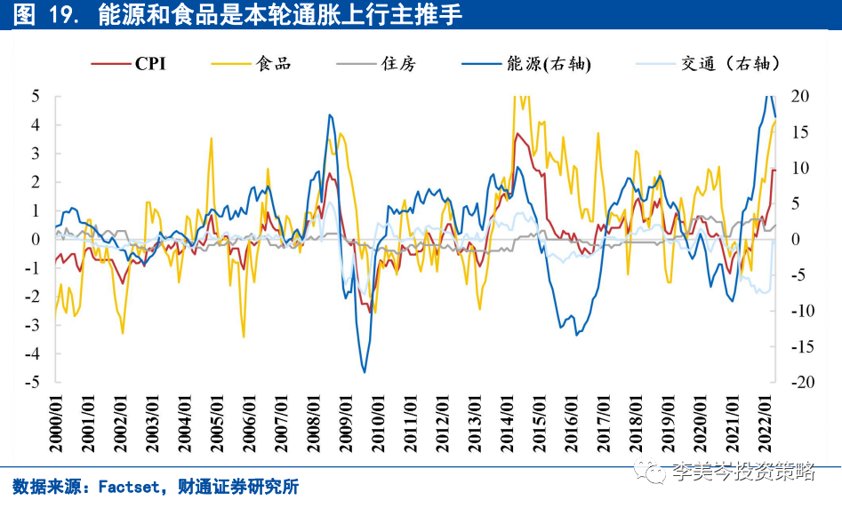 能源和食品同比分别达17.1%、4.1%,权重分别为7%、26%,对整体CPI贡献均超1%,是本轮通胀主推手。能源价格由当前地缘局势恶化所致,未来不排除长期位于高位可能;食品价格受能源价格变化驱动,变化时间滞后于能源,未来可能仍会危局高位。