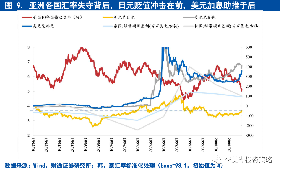 95-98年全球空头冲击亚洲各国汇率失守背后,金融自由化下有限外汇储备难阻热钱动荡是实质;背后助推者,日元贬值冲击经常账户在前,美元加息影响全球流动性在后。从危机爆发的进程看,当时亚洲国家紧缺的外汇储备成为当时索罗斯等国际空头得以狙击成功的原因;金融自由化的过快推进也使得各国政府无力管控进去自如的热钱,只能成为待宰的羔羊。而将时间回拨2年,日元开启贬值周期,韩国、泰国等亚洲新兴国家逆差快速加深,95较94年逆差分别增加113%、69%,外汇储备成为了他们头上的达摩克利斯之剑;后96-97年美国加息周期开始,全球美元紧缺的环境下,国际空头的冲击才成为压倒这些亚洲国家的稻草。