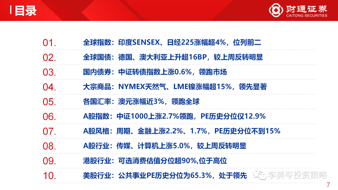 全球指数:表现最好的是印度SENSEX30(+4.3%),上周表现(-1.3%);表现最差的是深证成指(-0.1%),上周表现(-3.5%)。