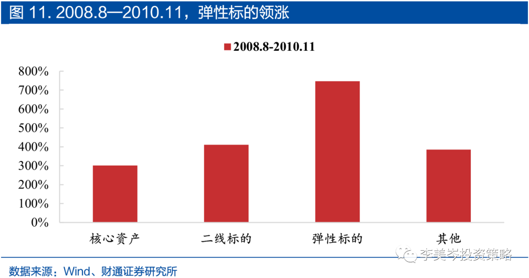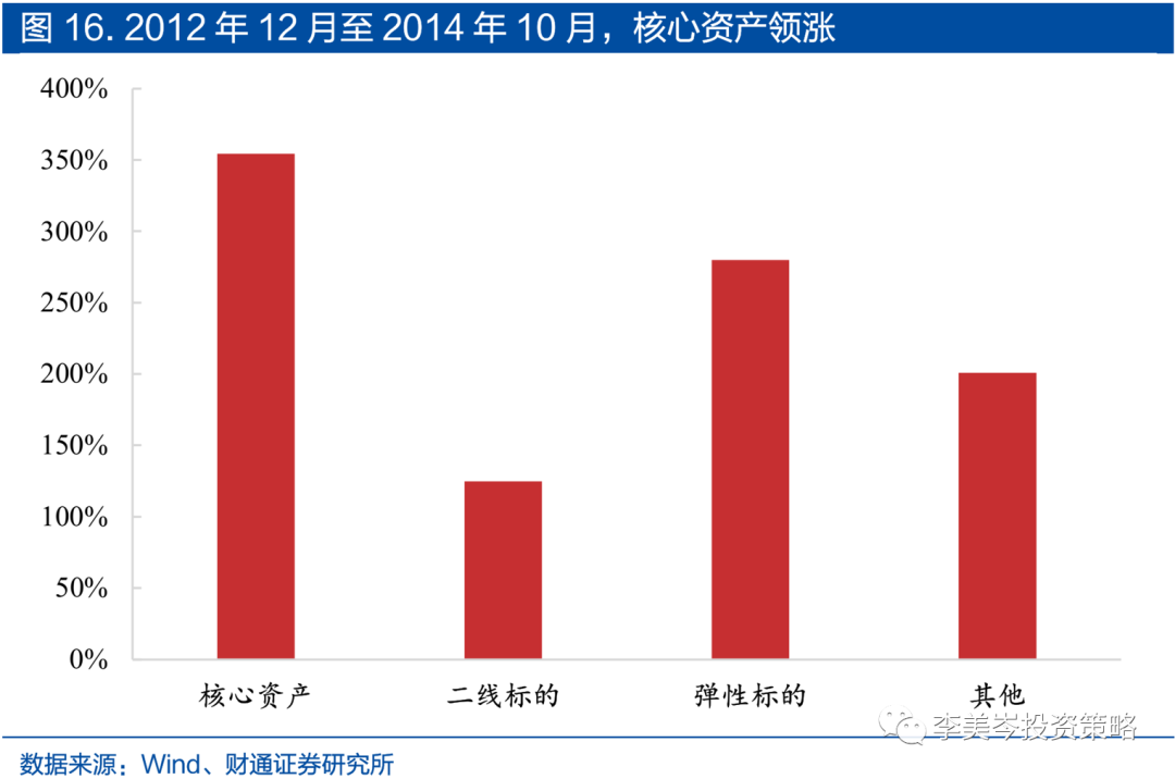 2012年12月至2014年10月,核心资产领涨,平均涨幅354%。弹性标的以280%位列第二。