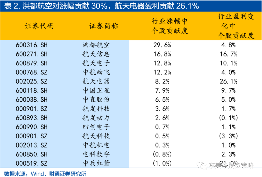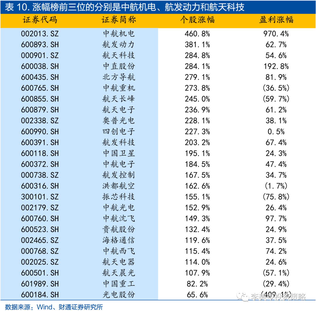 从具体个股的涨幅来看,位列涨幅榜前三位的分别是中航机电、航发动力和航天科技,其涨幅分别是460.8%、381.1%和284.8%。盈利改善前三位分别是中航机电(盈利改善970%,涨幅461%)、中直股份(盈利改善193%,涨幅284%)和中航沈飞(盈利改善98%,涨幅149%)。