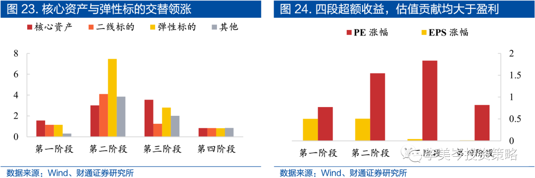 4)个股角度,核心资产与弹性标的交替领涨,成长性强的个股表现突出。其中第二阶段,PE上涨155%的同时,EPS上涨51%,“戴维斯双升”的驱动下,弹性标的表现突出。其他阶段,核心资产个股表现较优。