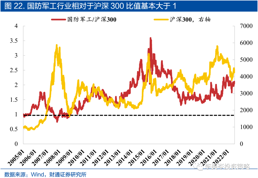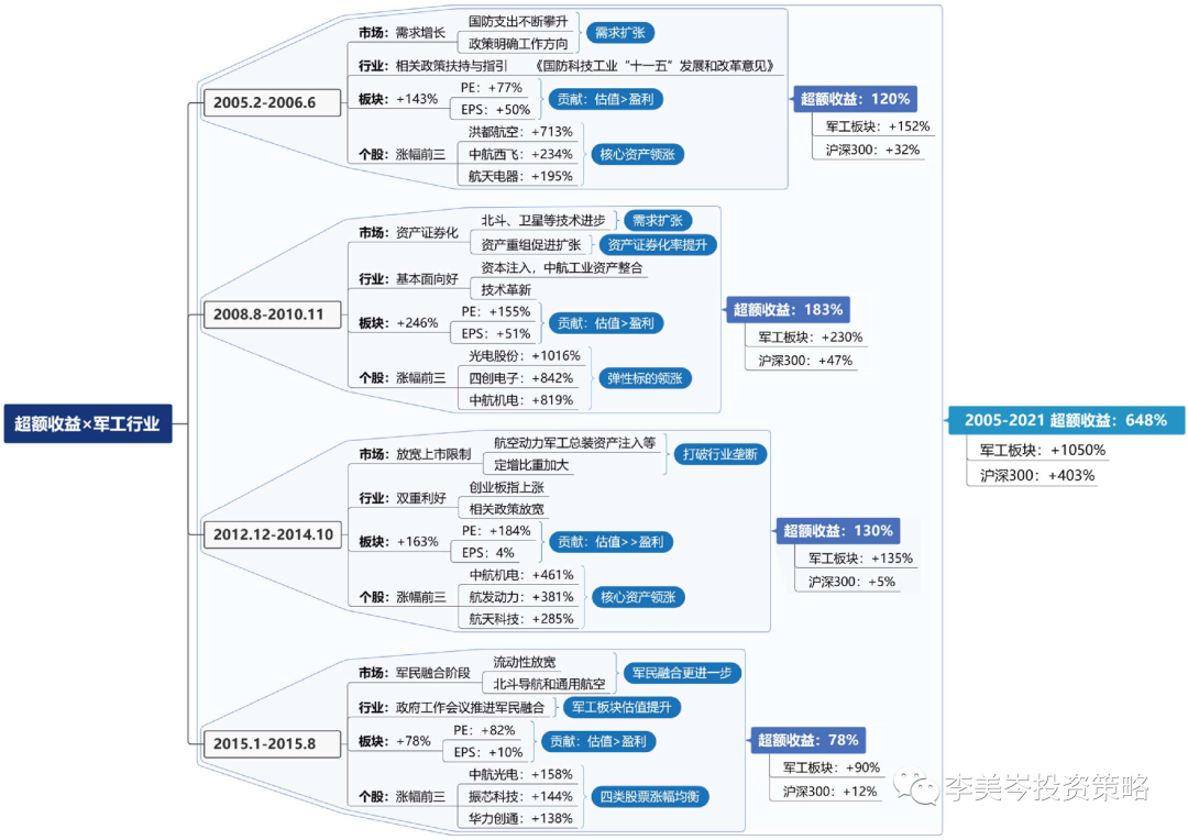 从2005年到2021年,国防军工涨幅为1050%,同期沪深300指数涨幅为402%,超额收益为648%。国防军工行业相对于沪深300的比值在大部分时间都大于1,说明从长期来看,国防军工板块在多数时间拥有超额收益,且估值驱动比重较大。