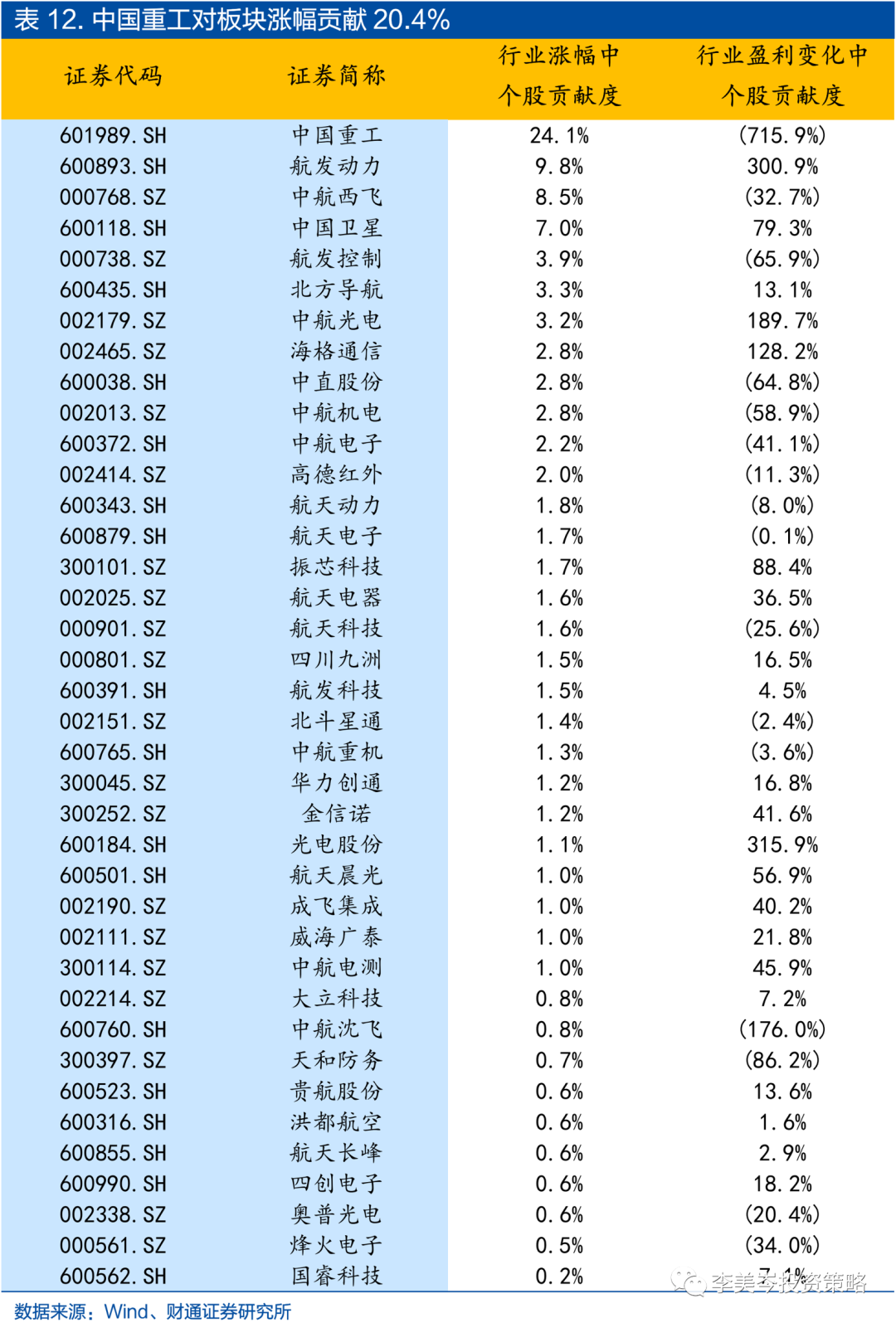 本轮国防军工行业实现78%的涨幅,在行业涨幅中个股贡献度前三位分别是中国重工、航发动力和中航西飞,其贡献度分别为24.1%、9.8%和8.5%。盈利涨幅达到10%,个股盈利分化明显。本轮上涨主要是靠估值驱动,盈利贡献相对较弱。