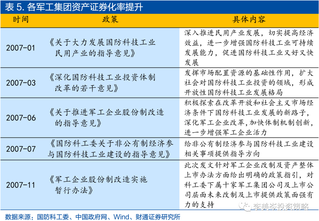 此外,在国务院发布的《2006年中国的国防》中,也提出要加快国防和军队的现代化建设,稳步推进军工企业股份制改造,致力提升军工证券化率。