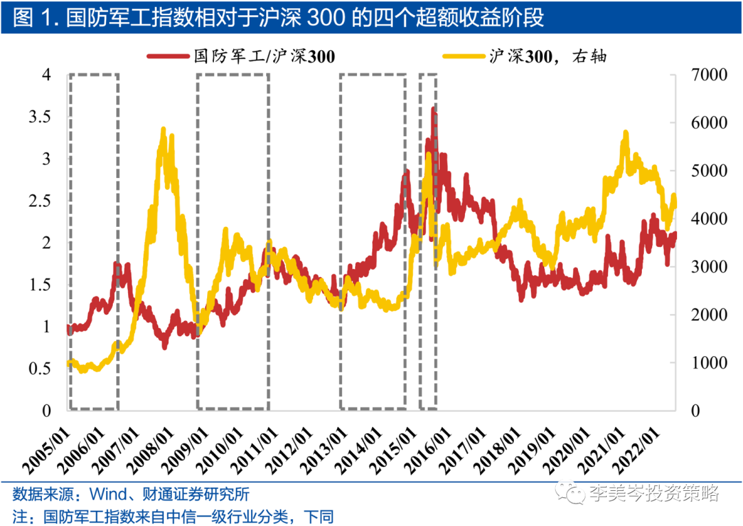 回顾自2005年以来,国防军工板块相对于沪深300的表现,我们选取了四个持续时间在半年到一年以上、超额收益相对较多、回撤相对较小的阶段供投资者关注与参考。