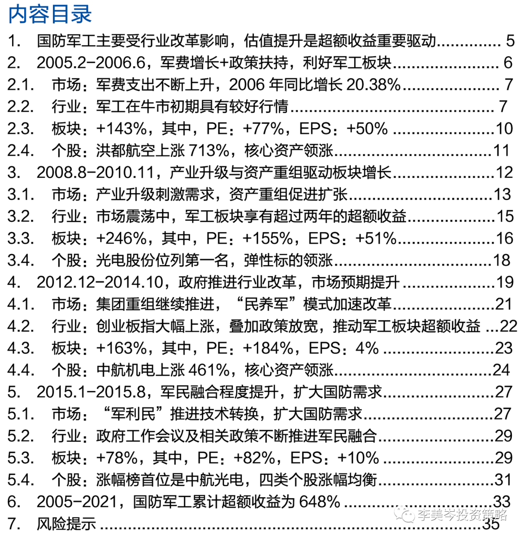 四段超额收益行情,均发生在大盘上涨时期,体现强贝塔属性,且时间均在2015年之前;军工行业改革是行情驱动因素,资产注入逻辑为主导,资产证券化率持续提升;在行业改革的预期下,历次超额收益行情,估值均大幅抬升,估值贡献均大于盈利。
