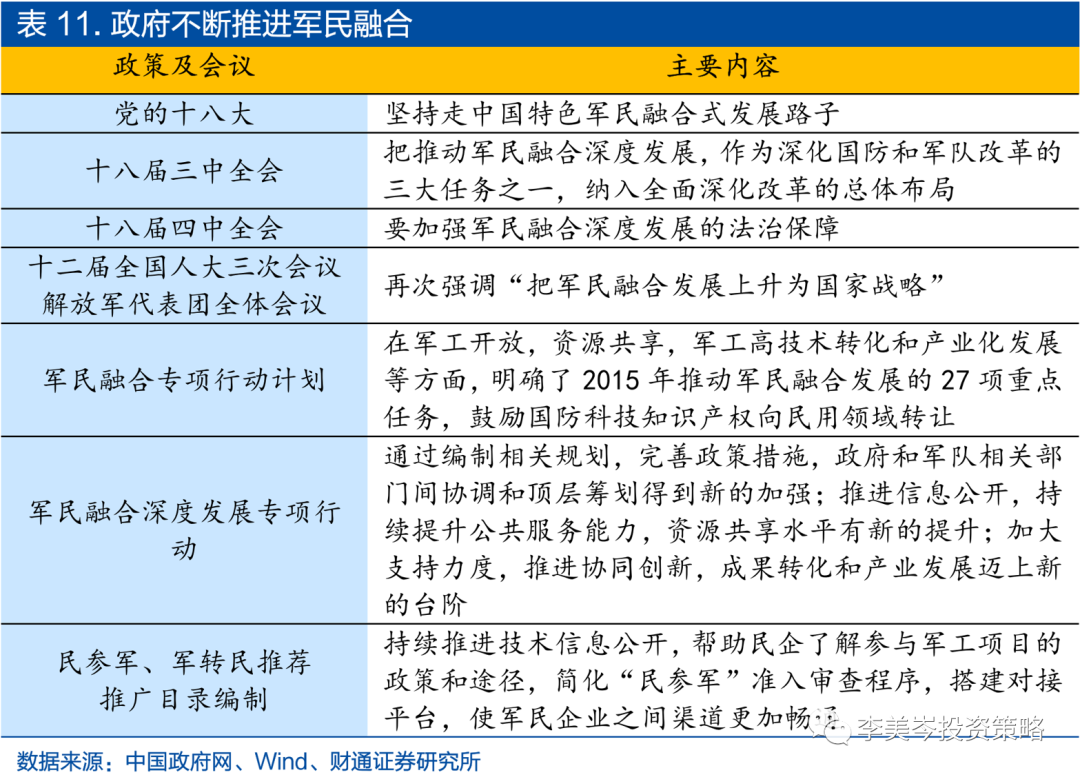 政府工作会议及相关政策不断推进军民融合。党的十八大率先提出要坚持走中国特色军民融合式发展路子。在十二届全国人大三次会议上,习近平总书记再次强调“把军民融合发展上升为国家战略”。此外,《军民融合专项行动计划》、《军民融合深度发展专项行动》、《民参军、军转民推荐推广目录编制》等相关政策进一步明确了如何进行军民融合,提出了开放军工,将军工高技术转化和产业化提上了工作议程。