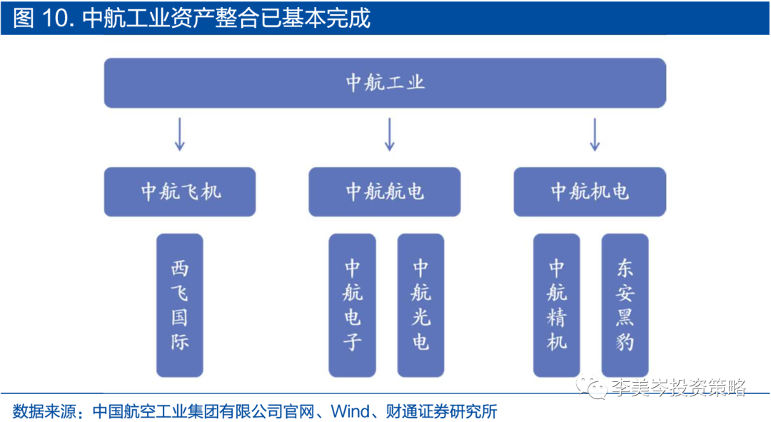 各军工集团都在积极利用上市公司平台,整合并做大做强其主业。其中以中航工业为典型代表:中航工业已经通过西飞国际基本实现了中航飞机公司的整合;原先的中航系统公司被分为中航航电和中航机电两家公司,中航航电旗下有中航电子和中航光电,中航机电旗下有中航精机和东安黑豹,其中中航精机有成为中航机电平台的可能。资产整合有助于企业扩张,实现集团的规模效应,提升行业的集中度。